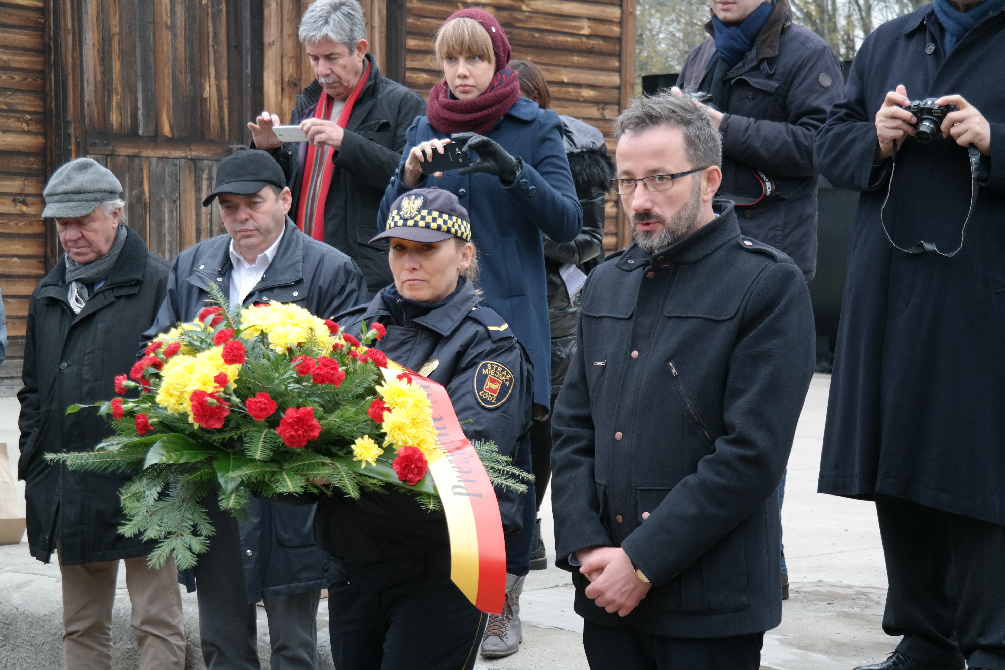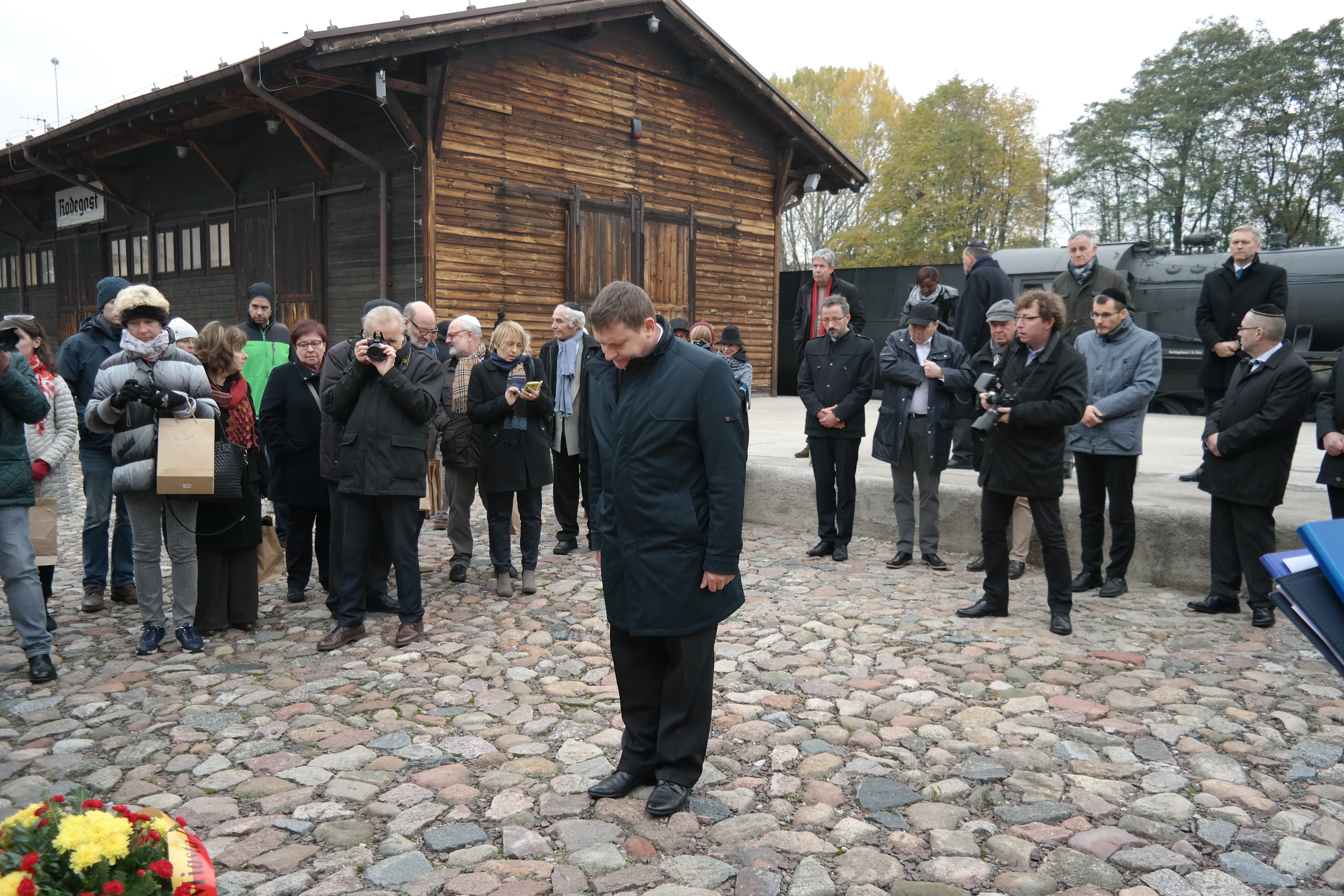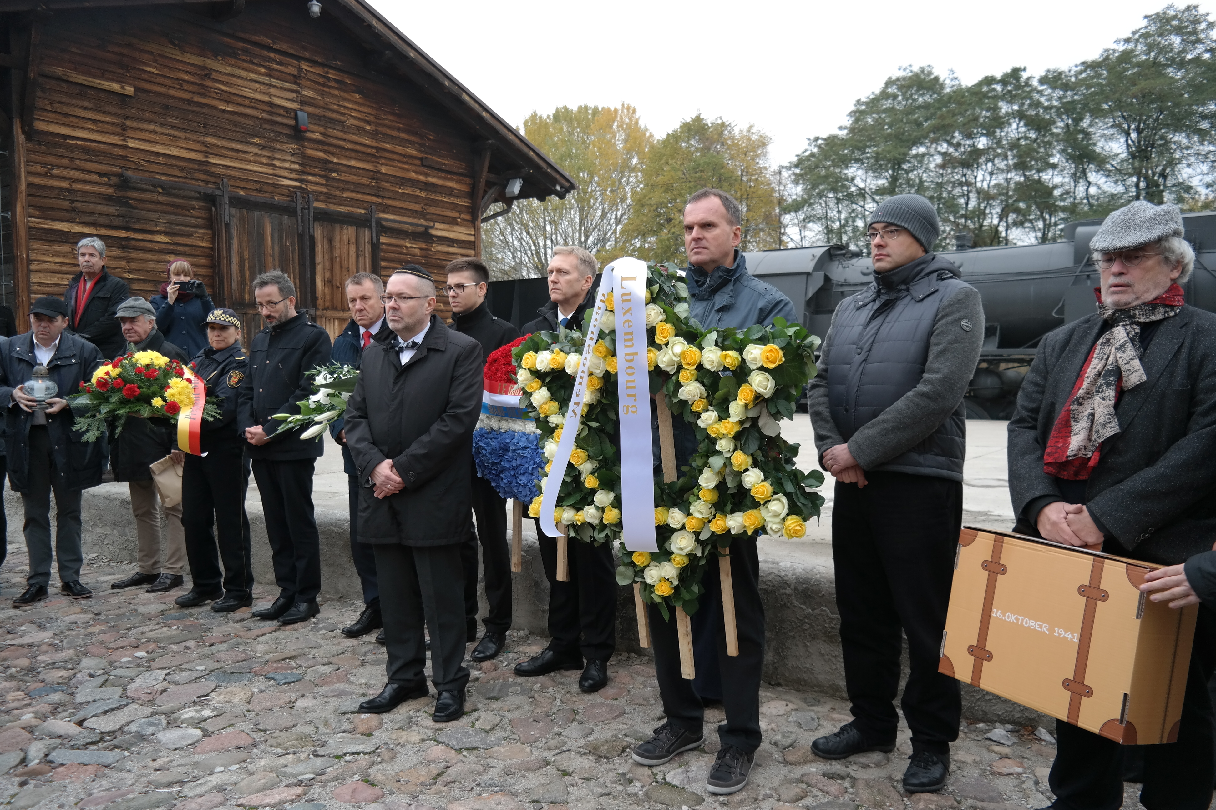 Lodž, čtvrť Baluty, památník v železniční stanici Radegast, pietní akt připomínající deportaci Židů z Lucemburska, říjen 2016